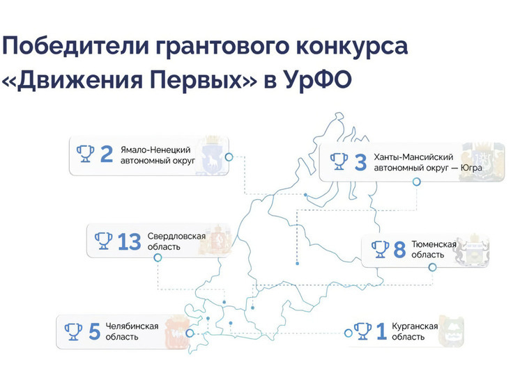 В УрФО определили 32 лучших проекта грантового конкурса «Движение Первых», общая сумма финансирования которых превысит 90 млн рублей. Свердловская область завоевала лидерство с 13 победами, опередив Тюменскую и Челябинскую области с 8 и 5 реализованными заявками соответственно.